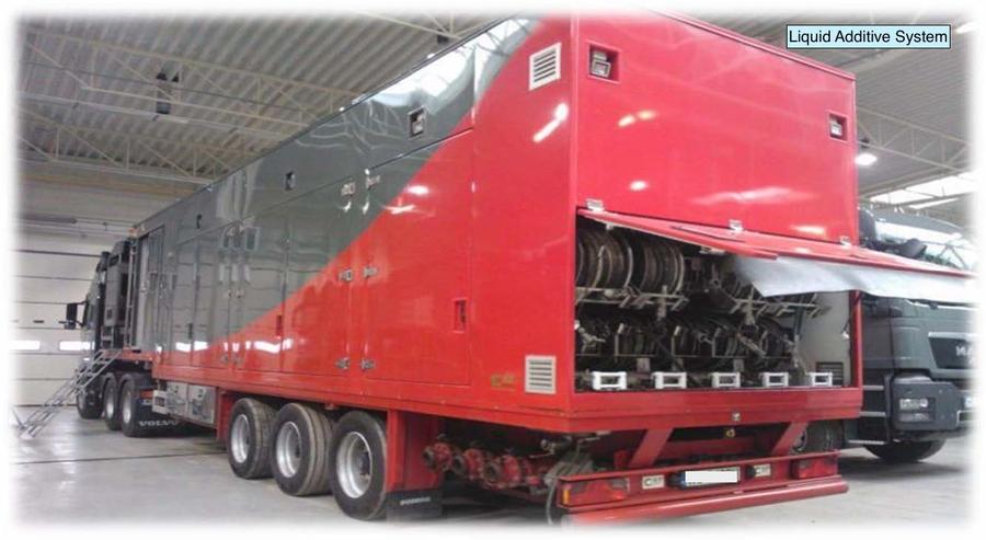 LAS unit has an insulated compartment to house 10 tote chemical tanks for 2640 gallons of chemical storage capacity. All tanks are suitable to be loaded/unloaded by forklift, and all of them are equipped with level indicators and additional level control system with display on control panel in operator’s cabin. Four tanks are equipped with stainless steel mixers. LAS is equipped with ten chemical injection pump systems, two transfer pumps and one centrifugal pump. The chemical additive pumps are electrically driven and provide failure-free injection of chemical additives. The metering system includes Coriolis flowmeters enabling accurate measurement of each chemical liquid additive injected. The discharge of each pump is fitted with a 75’ (~23m) chemical hose. Additionally, the unit is equipped with a Gorman-Rupp centrifugal pump, capable of pumping at 40 bpm. There is 1 unit.