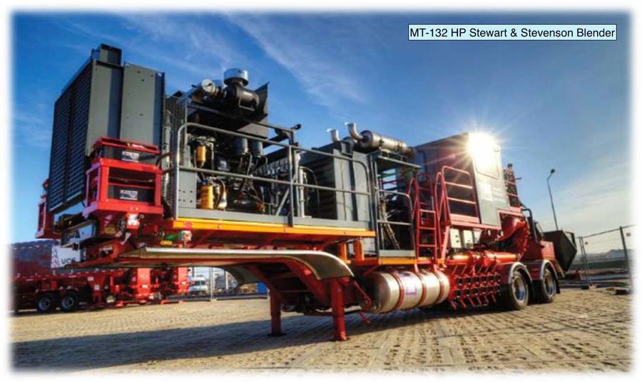 The Stewart & Stevenson MT-132HP is a trailer-mounted 128 bbl/min fracturing blender designed to mix slurries for fracturing treatments and providing boost pressure.