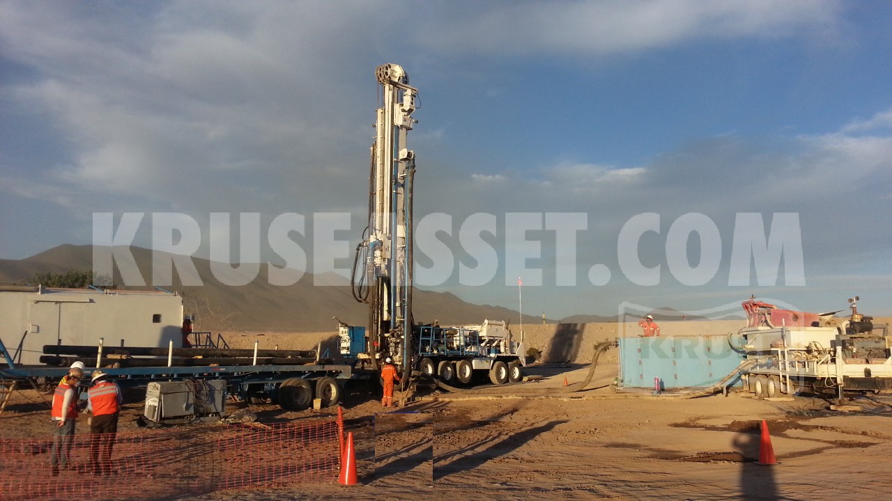 T130 2004 2004 SCHRAMM T-130 XD HEAVY HOIST TOP HEAD DRIVE CARRIER MTD DRILLING UNIT S/N J1300112 P/B DETROIT DDC/MTU 12V-2000 TADDEC 760 HO DIESEL ENG, TUFLO 750 AIR COMPRESSOR, HYDSYSTEM, SCHRAMM HYD TELEMAST ( FREE STANDING) HYD RAISED & SCOPED TOP HEAD DRIVE MAST 53’H MAX HEIGHT, 130,000# CAPACITY, SINGLE PIPE LOADING ARM W/BREAKOUT WRENCH, HANDLES RNG 3 CASING, SGL REDUCTION DESIGN F/HIGH TORQUE & LARGE DIA. DRILLING, SPLIT TABLE ASSEMBLY W/20” OPENING & 28” OPENING WHEN FRONT OF TABLE IS FULLY RETRACTEDM API 3 BUSHING IN USE FOR ALL SLIPS, HYD/AIR DRILLERS CONTROL PANEL, MTD ON 2003 5-AXLE CRANE CARRIER. VIN: 1CYDGD5804T046370, P/B CAT C-12 DIESEL ENG, JACOBS BRAKE, AETON/ FULLER 8 SPD TRANS, TANDEM FRONT AXLES W/425/65T22.5 FRONT TIRES & (3) REAR DRIVE AXLES W/12R22.5 REAR TIRES STEEL DISC WHEELS (3) HYD LEVELING JACKS